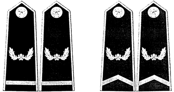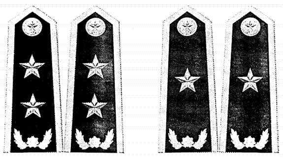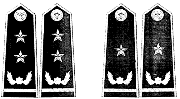 d)[6] Sao cấp hiệu thể hiện chức vụ lãnh đạo bằng kim loại màu vàng, vân nổi. Sao được gắn thành một hàng thẳng dọc ở giữa nền cấp hiệu, nằm giữa biểu tượng khiên, cành tùng và khuy cấp hiệu.