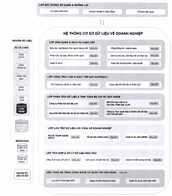 Giai đoạn 1 (Năm 2025): Xây dựng CSDL doanh nghiệp cơ bản tích hợp 04 nguồn dữ liệu (đăng ký doanh nghiệp, thuế, BHXH, xuất nhập khẩu). Ban hành và vận hành Bộ chỉ số đo lường sức khỏe doanh nghiệp (phiên bản cơ bản).