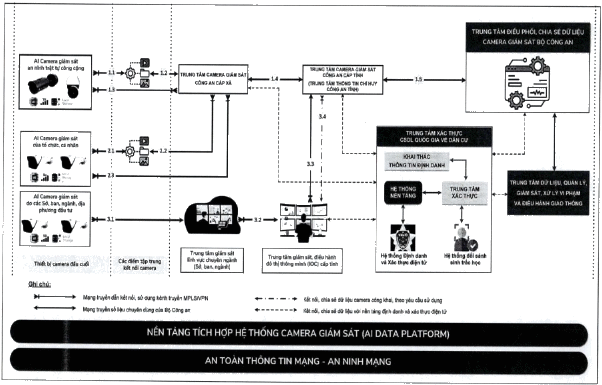 - Dữ liệu từ các camera giám sát an ninh, trật tự công cộng được kết nối theo mô hình phân tán về các điểm tập trung kết nối hoặc kết nối trực tiếp về Trung tâm camera giám sát Công an cấp xã (tùy theo khoảng cách và số lượng camera); từ các điểm tập trung kết nối về Trung tâm camera giám sát Công an cấp xã; từ Trung tâm camera giám sát Công an cấp xã kết nối về Trung tâm camera giám sát Công an cấp tỉnh (thuộc Trung tâm thông tin chỉ huy Công an tỉnh); từ Trung tâm camera giám sát Công an cấp tỉnh kết nối về Trung tâm điều phối, chia sẻ dữ liệu camera giám sát Bộ Công an đảm bảo tính thống nhất, đồng bộ trên phạm vi toàn quốc.